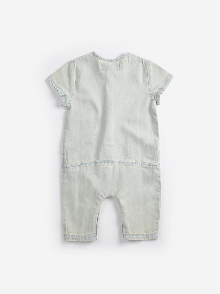 Light blue overall. Designed with short sleeves, front button fastening, crotch snap fastening, baggy fit, round neck, patch pocket, lightweight fabric and denim. 100% Organic Cotton