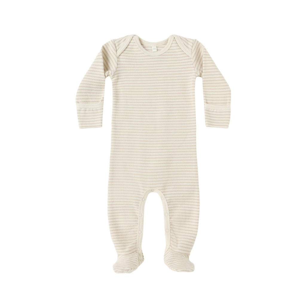 Our Footed Jumpsuit is designed for comfort and ease, with lap sleeves and snaps along the inseam for easy changes. Sizes NB, 0–3m, and 3–6m include fold-over hand mitts, while size 6–12m features grips on the soles to support little movers.