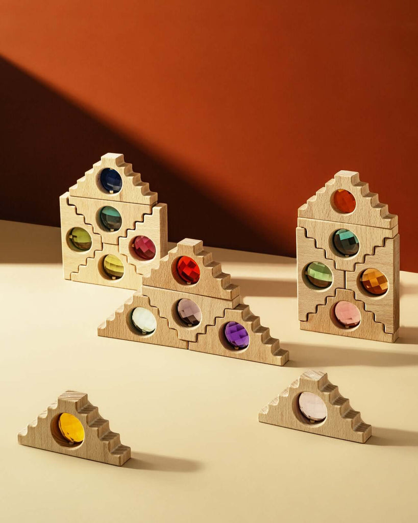 Introducing the Kaia Blocks, our sculptural ode to symmetry, sparkle, and open-ended play. With their stepped silhouette and jewel-toned insets, these wooden blocks are equal parts art piece and toy. Handcrafted from solid beech wood and finished with lucite “gems” that catch the light, each piece invites creativity from every angle (literally).