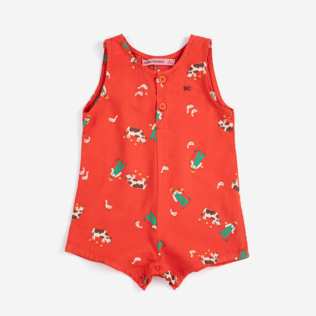 Red playsuit. Designed with sleeveless, front button fastening, crotch snap fastening, embroidery, loose fit, over knee length, round neck and half placket. 100% Organic Cotton