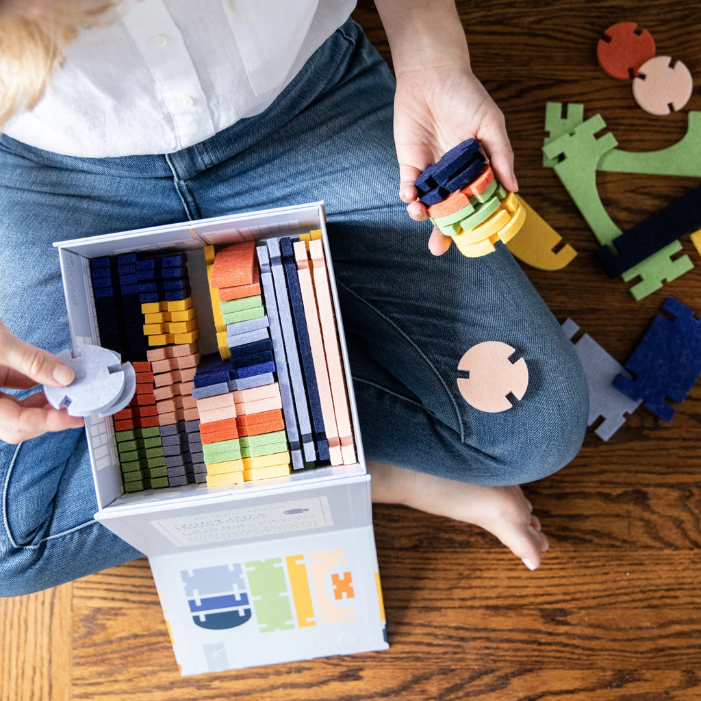 Quiet, lightweight and sturdy, these innovative connecting blocks encourage creative problem-solving along multiple mathematical planes. Made from felt out of recycled water bottles, our washable interlocking blocks foster creative problem-solving and collaborative play.